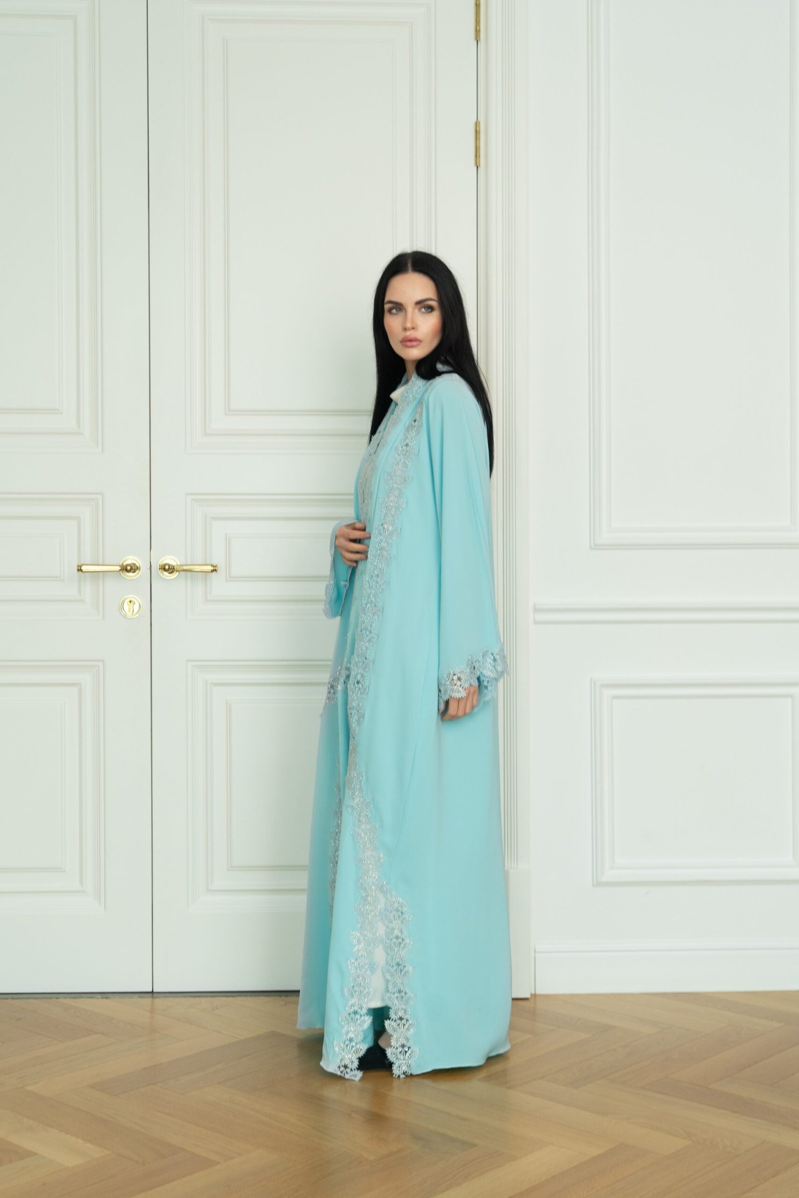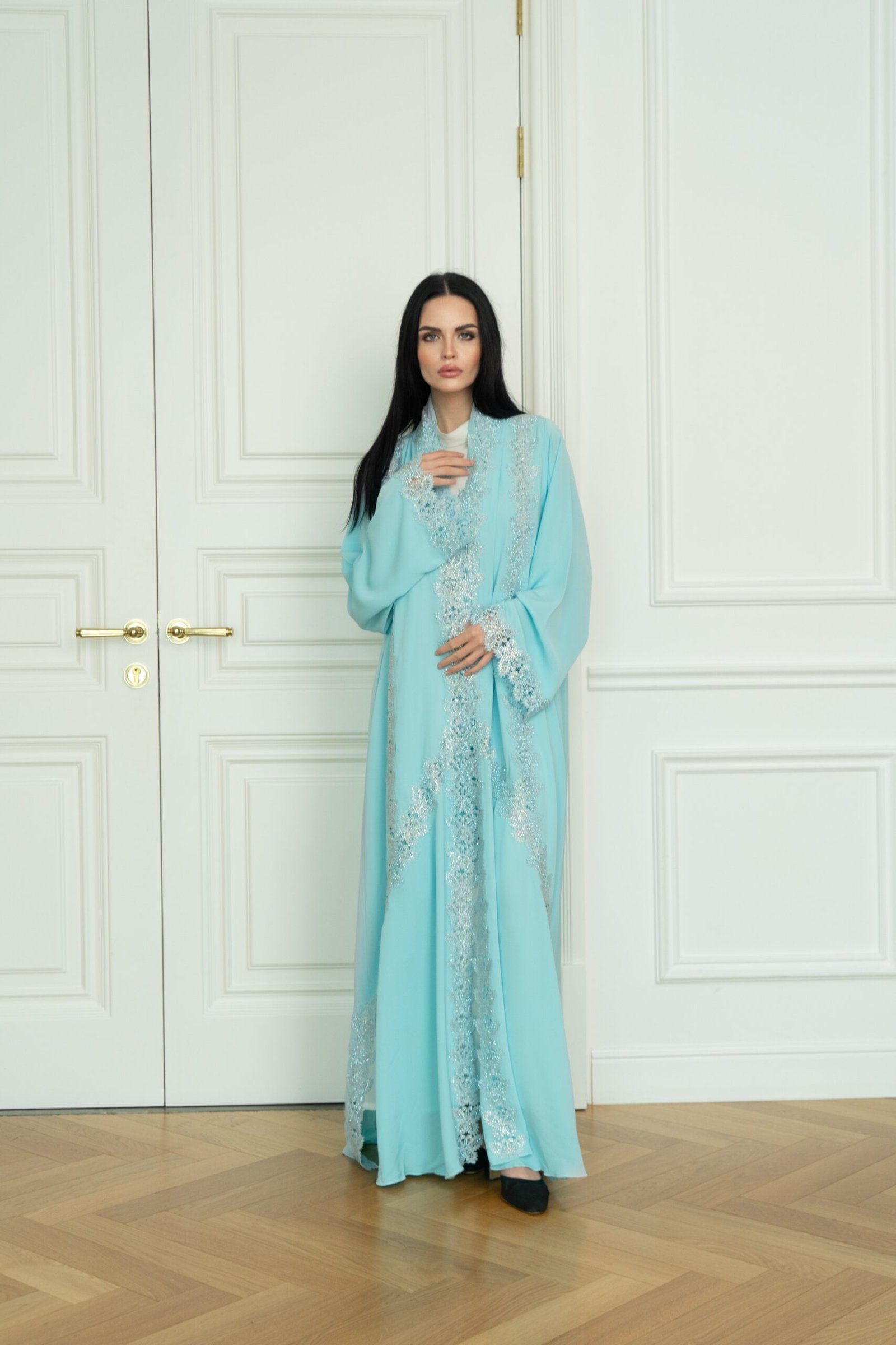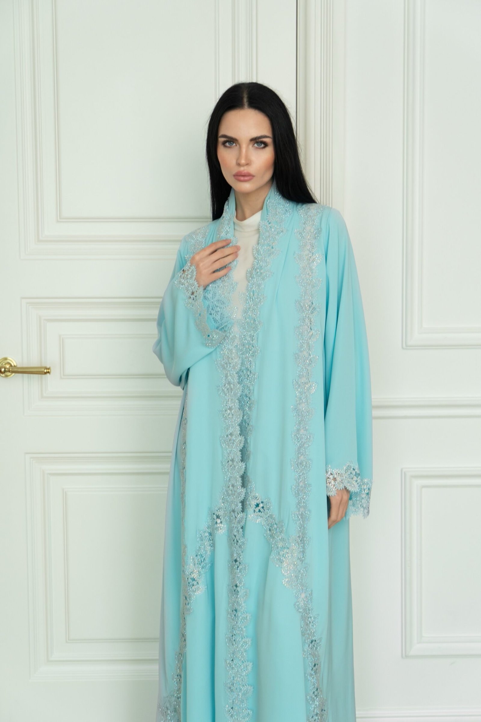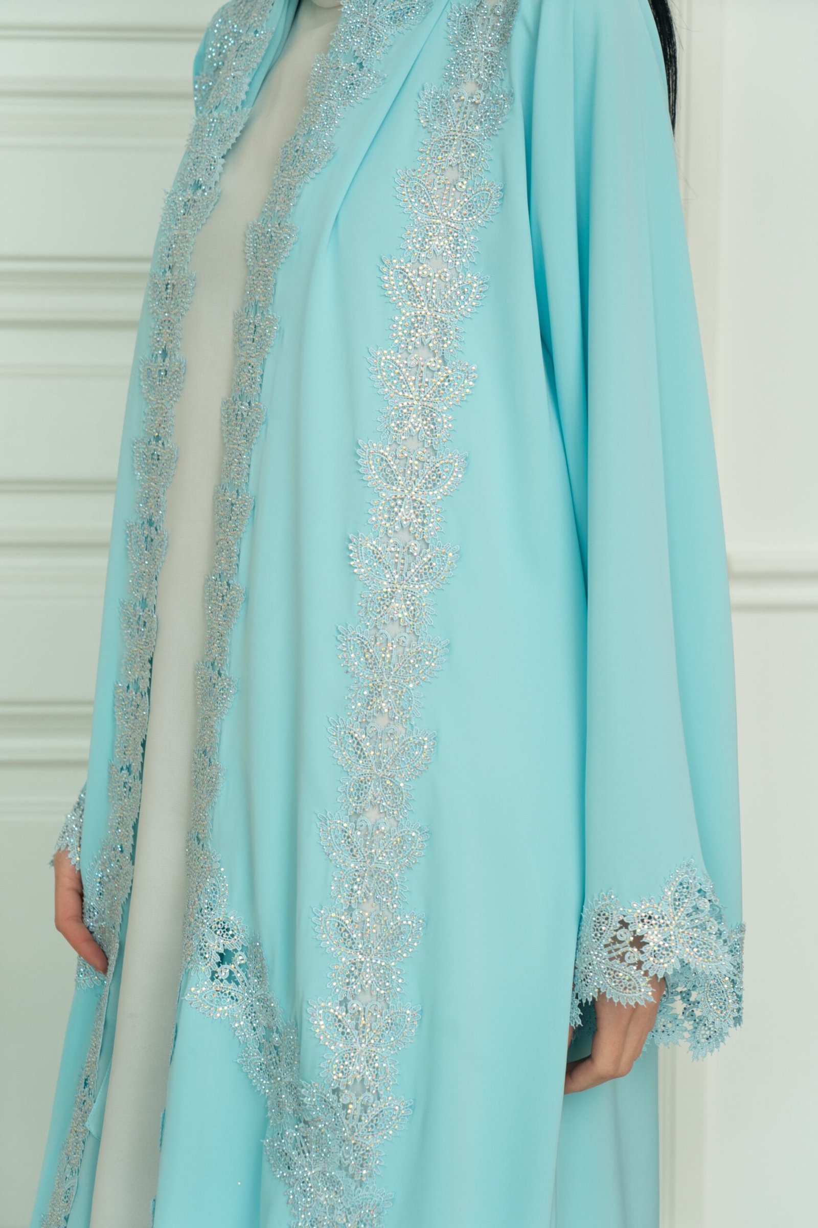 هذه العباية مزينة بكريستالات رقيقة، ويُنصح بالتنظيف الجاف والغسيل بالماء البارد للحفاظ عليها في أفضل حالاتها.
